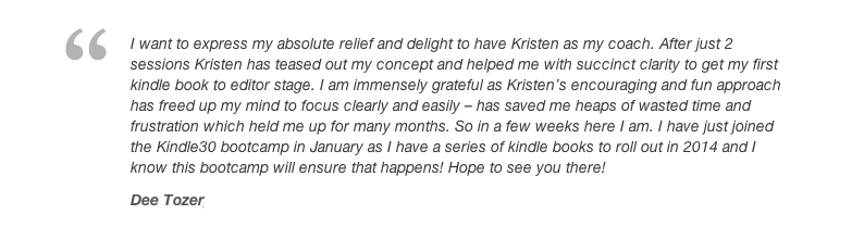 - Your first or next showcase book written by the end of April 2014 (cross it off your bucket list)! Get published before Summer! Disclaimer: results may vary and you’ll see best results if you follow the trainings and fully participate in the challenge.